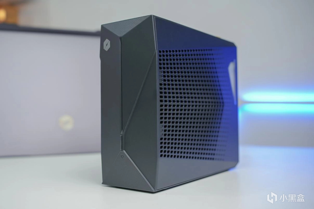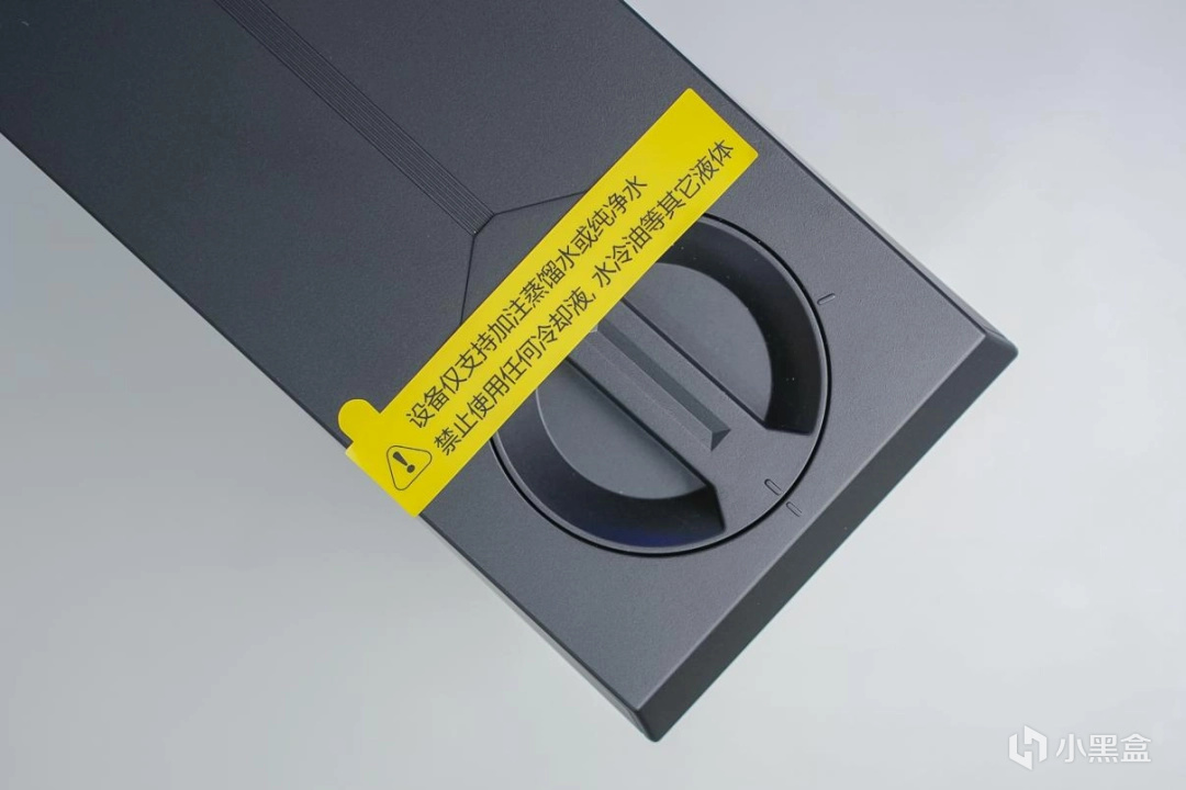 除了筆記本本體外,包裝內還帶有冰河水冷套件,水冷機的尺寸嬌小,大約只有2.25升左右,外形類似一個miniPC,機甲風設計語言。上方是注水口,建議灌注蒸餾水和純淨水。左側有一個小窗可觀察當前水位。連接方式非常簡單,通過串流將水冷機連接筆記本,水冷機上的水管接口是磁吸的。