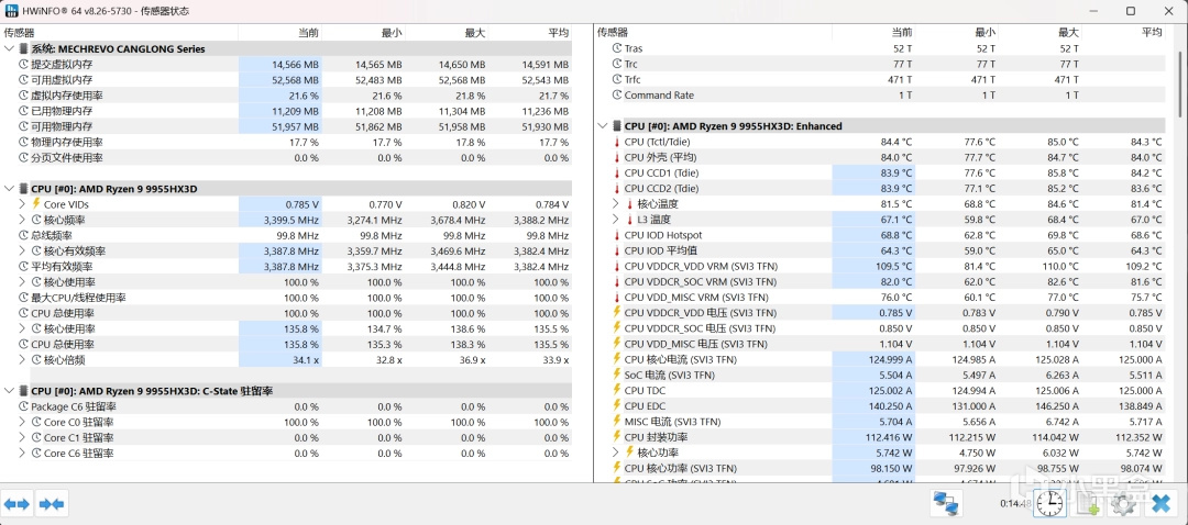 接下來是烤機測試,將筆記本設置爲獨顯直連,高能狂暴模式。首先在不接入水冷套件的狀態下,單烤CPU 15分鐘,此時CPU溫度84度,功耗112W左右。