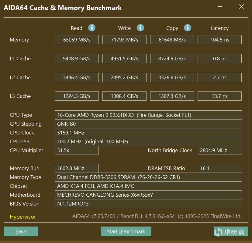 內存方面,蒼龍16 Ultra搭載了兩條金士頓的32GB DDR5 5600MHz內存,讀取速度達到65059MB/s,寫入速度達到71793MB/s,拷貝速度爲61649MB/s,時延爲104.5 ns。