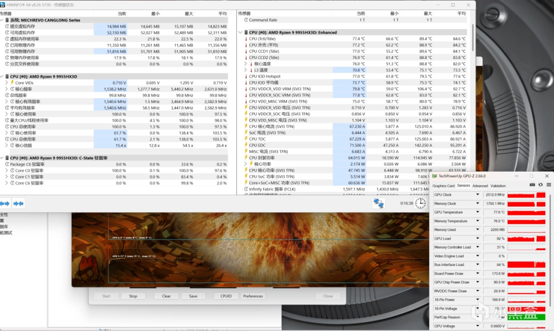 進行15分鐘的雙烤,CPU溫度77度,功耗約65W,GPU溫度也是77度,功耗約175W。整機滿血釋放240W功耗。噪音大約52db左右。