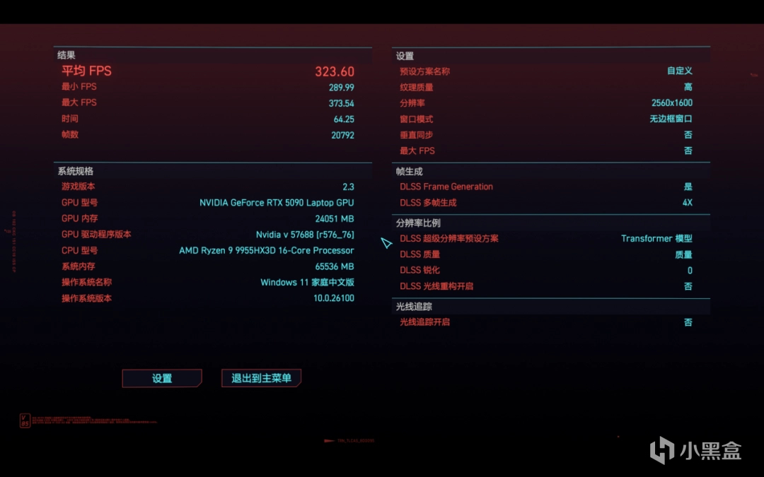 最後來看一下《賽博朋克2077》在超級畫質下開啓DLSS 4X,幀數能來到323fps,在開啓路徑追蹤後則是173fps。
