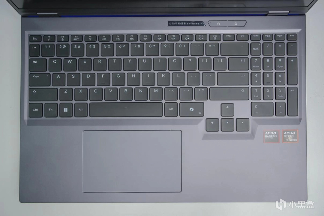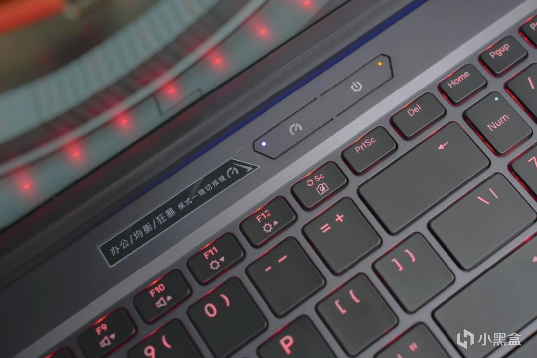 C面全鍵無沖人體工程學鍵盤,按鍵表面0.2mm的微弧度更貼合手指,1.4mm鍵程,附帶獨立數字小鍵盤,單鍵RGB支持1600萬色調光。最上方是開機鍵和性能控制按鈕。