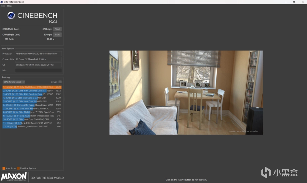 在理論測試環節中,我們將在連接水冷套件和不連接水冷套件兩種環境下進行測試,首先是不連接水冷套件進行Cinebench R23跑分。AMD銳龍9 9955HX3D處理器多核分數37704,單核分數2049。在連接上水冷套件後,多核分數提升6%,來到了40033,單核分數提升3%來到2120。