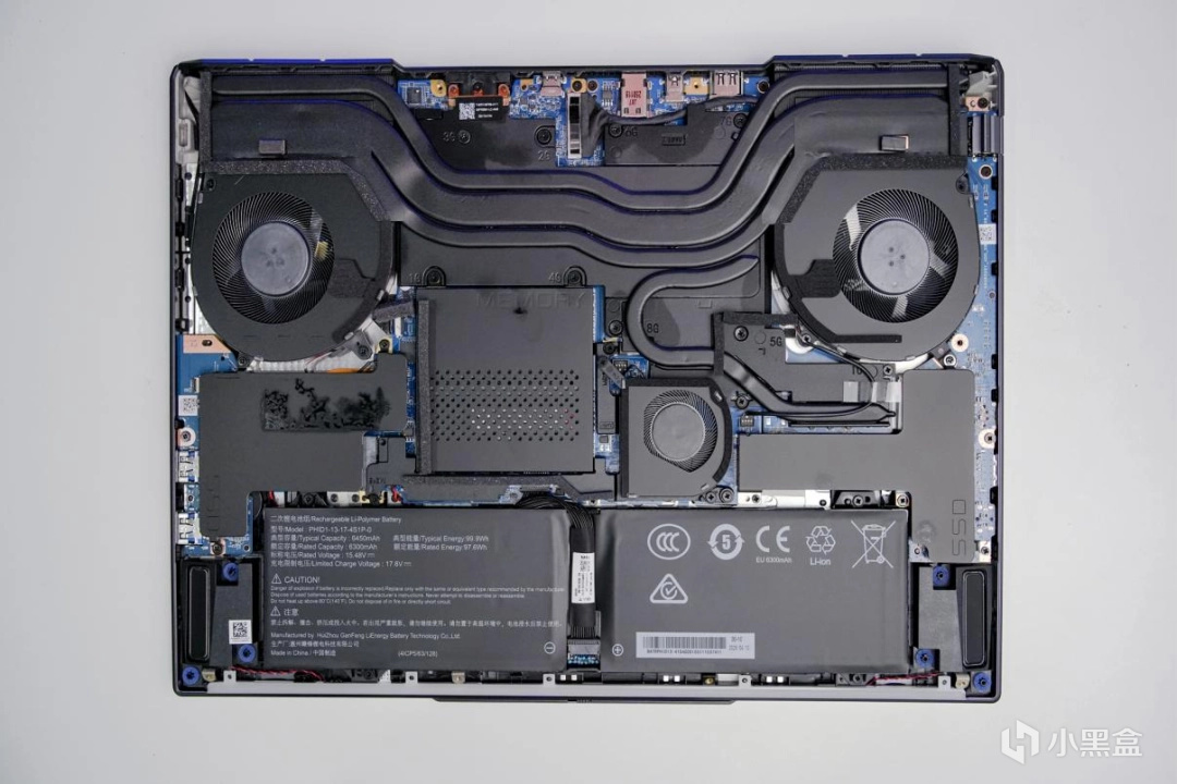 拆開後蓋,內部設計還是非常精美工整的,散熱採用了5熱管+3風扇的設計,內吹結構,熱量就從頂部排除,並且貼有納米相變散熱硅脂。除了出廠預裝的SSD外,右側還額外提供了一個PCIe4.0×4的擴展接口。電池爲99.9Wh,續航時間接近6小時。