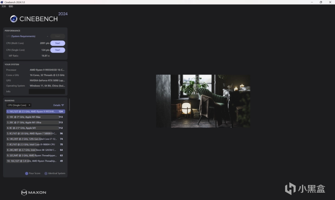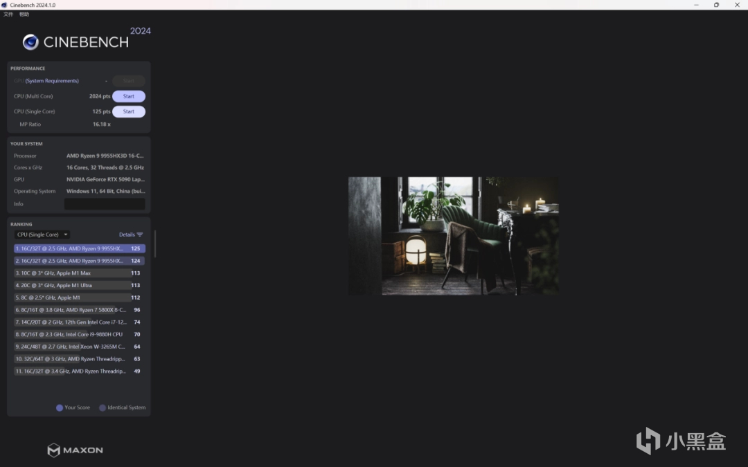 在Cinebench 2024中,多核分數2024,單核分數125,再接上水冷套件後多核分數提升3%來到2091,單核分數則基本保持一致。