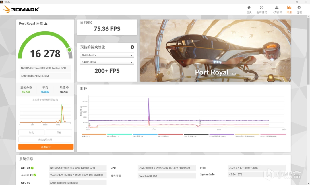 在Port Royal光追測試中,得分16278,接入水冷套件後分數來到16467。