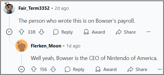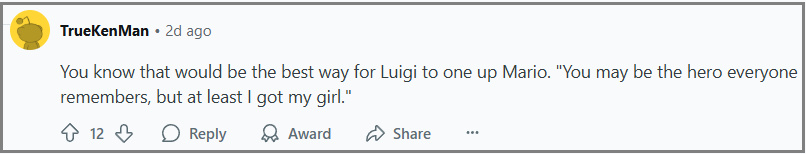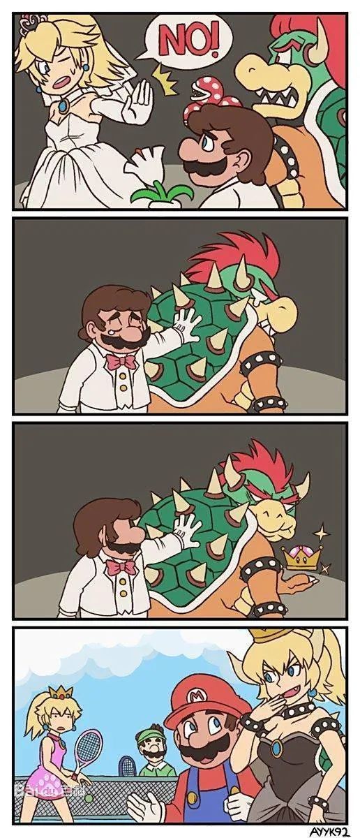 说实话,嘲笑一个爱而不得的人非常没品,堪比布鲁斯韦恩的爹妈笑话。但配合马里奥系列40年以来的一系列故事,却又让这事变得风味绝佳。