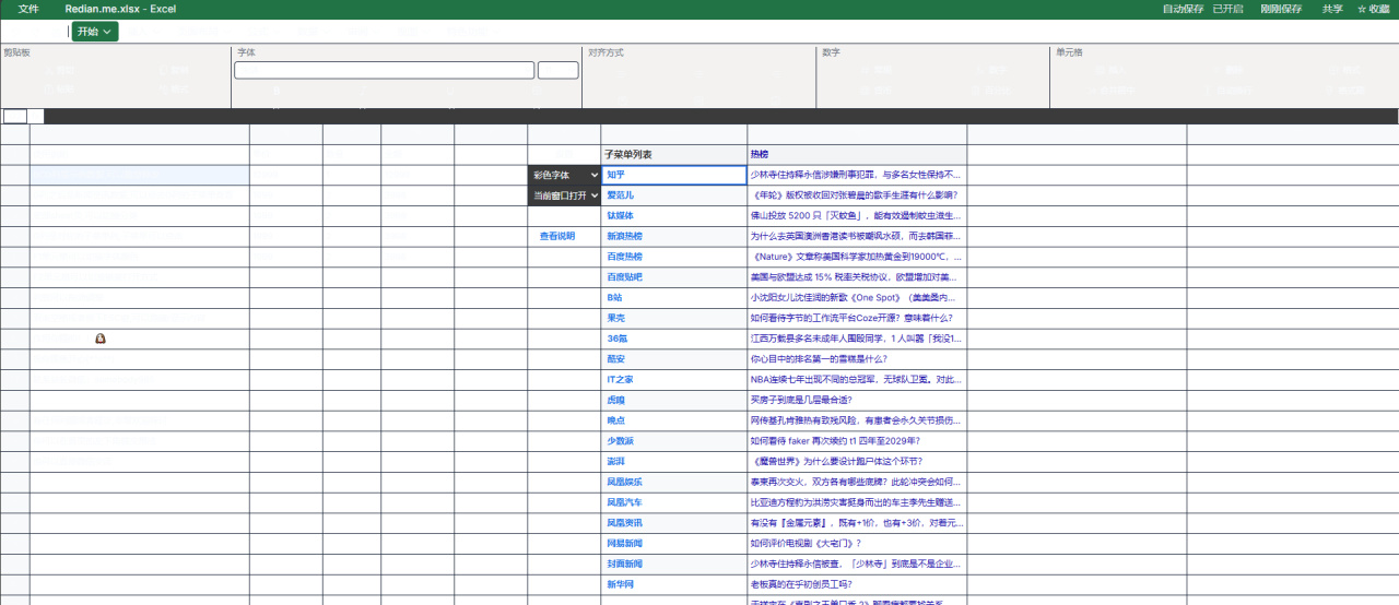 (有驗證人機的選項直接關掉,不要管他)這是一個能讓你每天正大光明摸魚的玩具,點開主頁右上角“快樂摸魚”選擇excel主題或者word主題,就可以直接觀看全網幾十個熱門榜單和資訊源,以下爲Excel主題演示