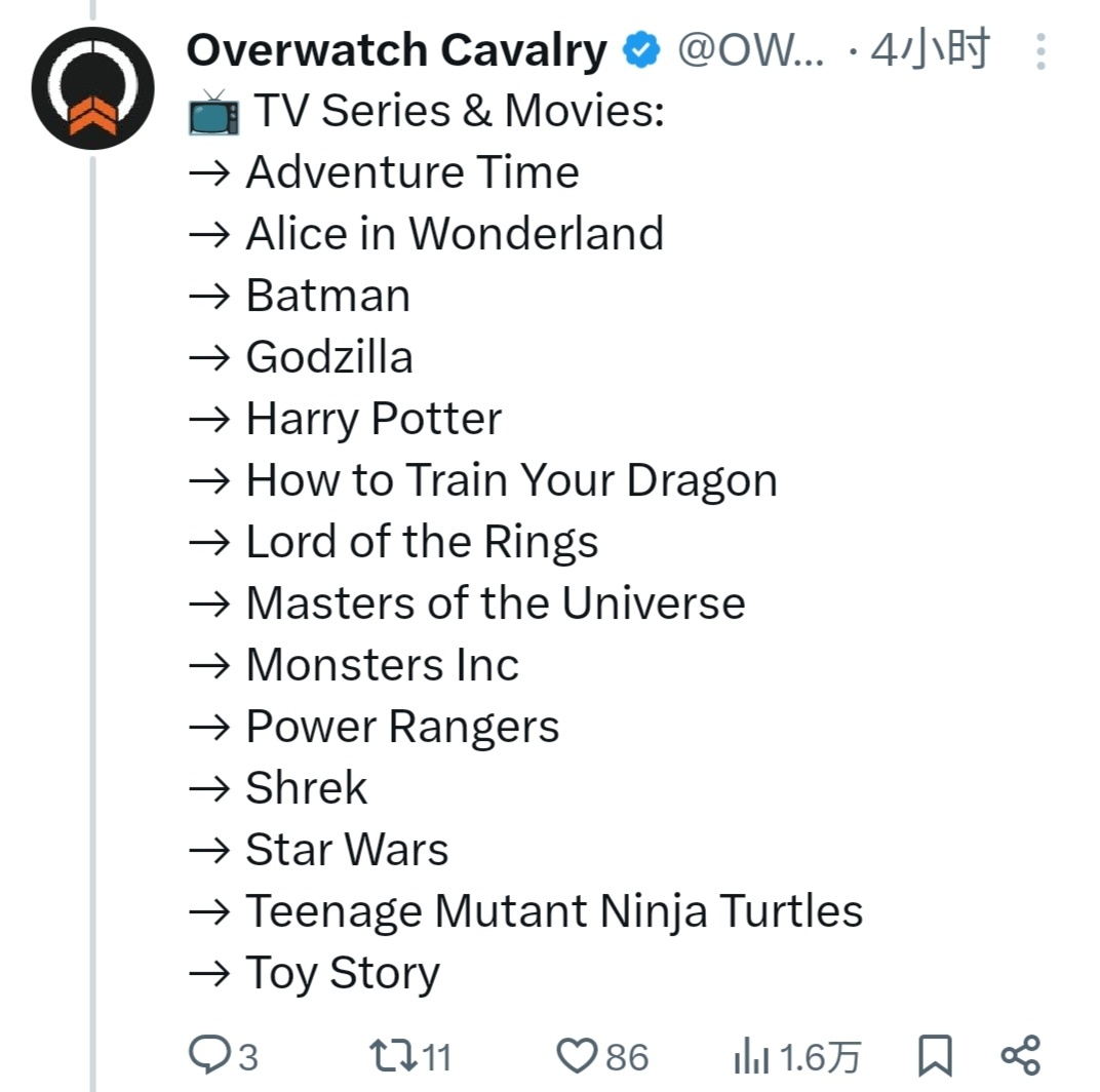 探險時光,愛麗絲夢遊仙境,蝙蝠俠,哥斯拉,哈利波特,馴龍高手,指環王,宇宙巨人希曼,怪物公司,超凡戰隊,怪物史萊克,星球大戰,忍者神龜,玩具總動員
