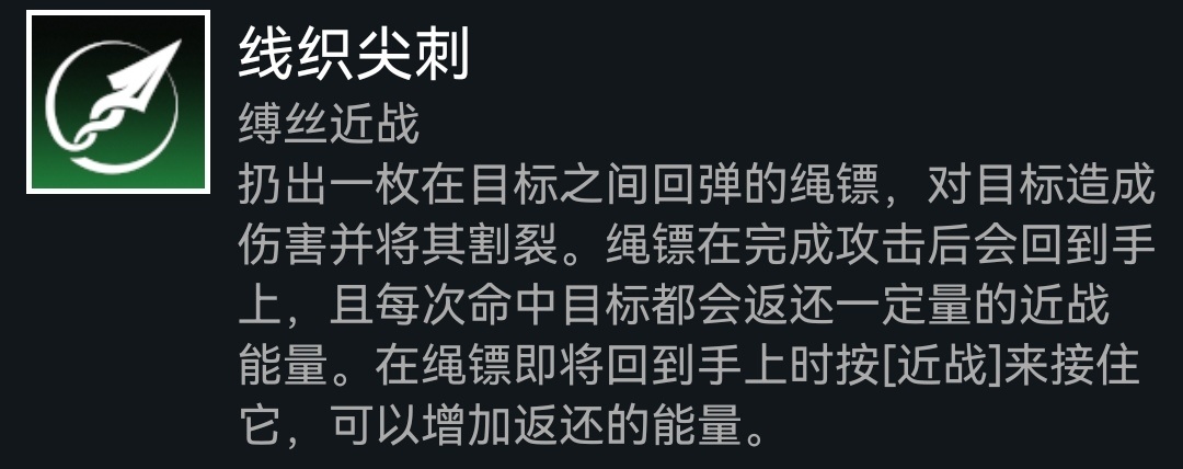 其實,纏結不僅是單純的回收,而是在線織尖刺接觸的時候引爆,在接住飛鏢時在你手中重新生成一個纏結。