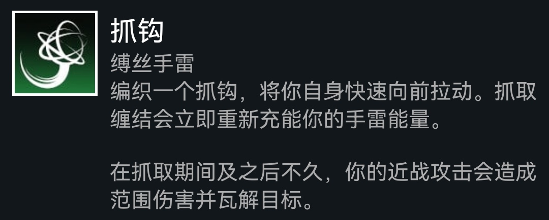 本套配裝以近戰爲核心,所以近戰屬性往死裏堆,對接住飛鏢返還的近戰能量也有加成,完全可以不通過賭徒閃身回覆近戰,手雷帶勾爪,同時喫到近戰屬性加成,不用堆手雷屬性,勾爪勾住纏結或悠悠球都可以返還手雷能量,所以我們手雷是不會斷的。