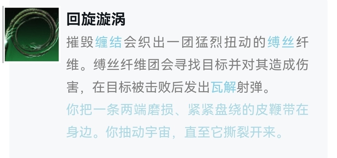 可以一次引爆兩個纏結?誒!☝🤓相信很多人看到這已經不約而同想到縛絲獵人的悠悠球了,我敢說全世界每個縛絲玩家都有過跟隊友搶纏結的經歷,現在好了,飛鏢全自動巡航回收,一次還得倆悠悠球,通過這件金裝我們完全可以解放大腦,沒事就往丟飛鏢,成熟的飛鏢會自己找到纏結給你,剩下的交給悠悠球思考就行,所以本配裝核心星象:扭轉漩渦(俗稱悠悠球)