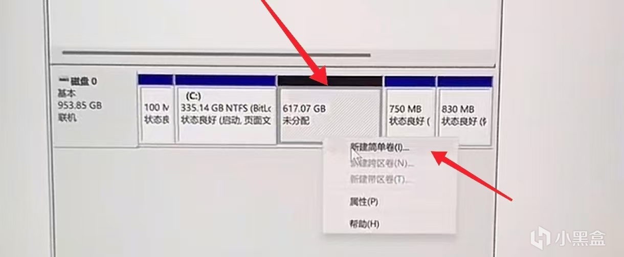 壓縮完後,會產生一個未分配的的區域,我們右擊選擇新建簡單卷
