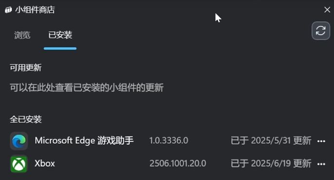 快捷键Win+g可以打开,点击屏幕上方的小程序组件商店可以看到Microsoft Edge 游戏助手已被安装
