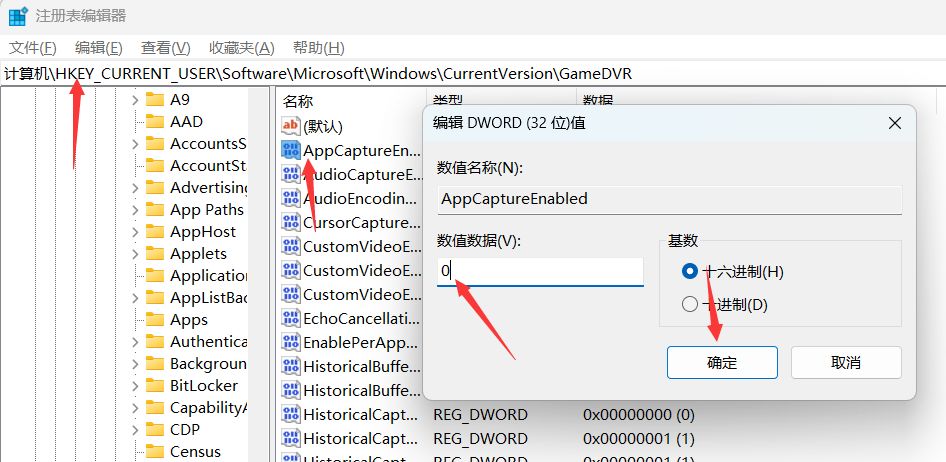来到目录后双击AppCaptureEnabled,修改值为0,按确认即可,这样修改以后打开游戏就不会弹窗了