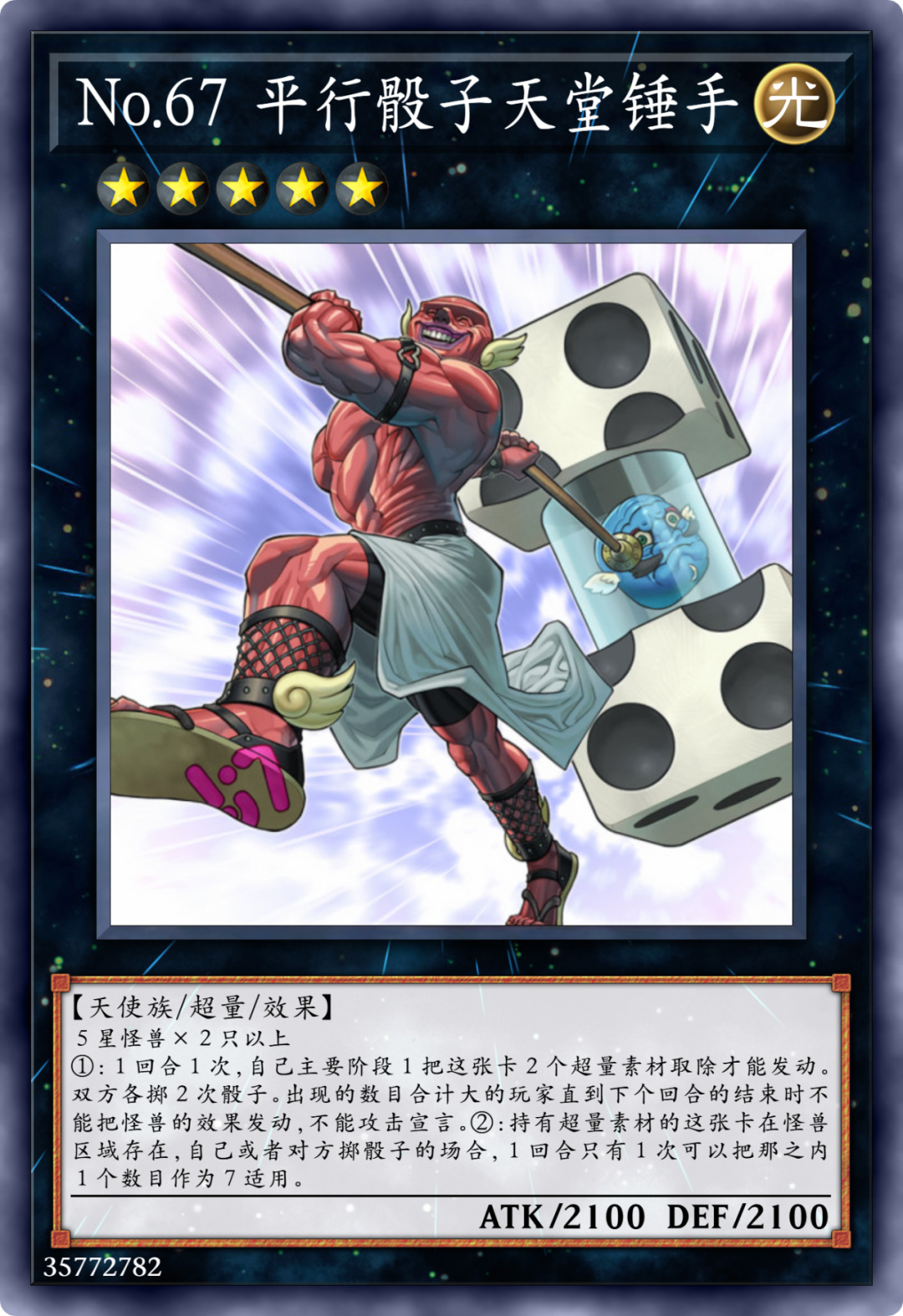【NO.67 平行骰子天堂锤手】能够封锁怪兽效果的发动以及攻击宣言。同样是封锁希卡牌,江湖人称小法法。