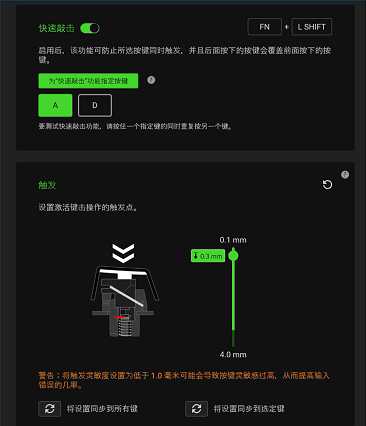 围绕着可调节&自定义触发点(键程),可以满足不同场景下个性化需求。例如,在FPS游戏里,你需要快速操作时,打开快速触发模式。按键的触发点和复位点可以调到低至0.1mm。