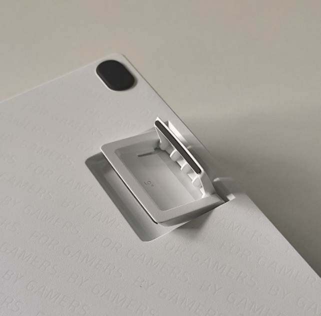 键盘背部有5个防滑脚垫和两段式(6°和9°)的脚撑。脚撑上面印有数字,标明倾斜角度。背板印满了“FOR GAMERS.BY GAMERS(源于玩家,服务玩家)”,这款键盘由玩家制作,为玩家设计。
