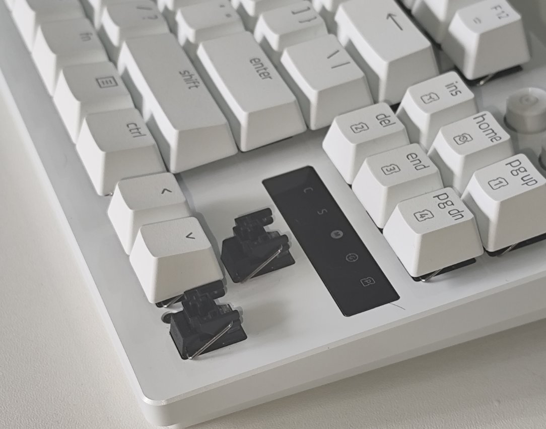 关掉幻彩、拔掉键帽,你就看到这款键盘的核心——第二代模拟光轴。相比于第一代,第二代模拟光轴的触发范围调节由1.5mm-3.6mm提升到了0.1mm-4.0mm,触发力度由40g降低到50g,灵敏稳定性更高、按压力度更轻。
