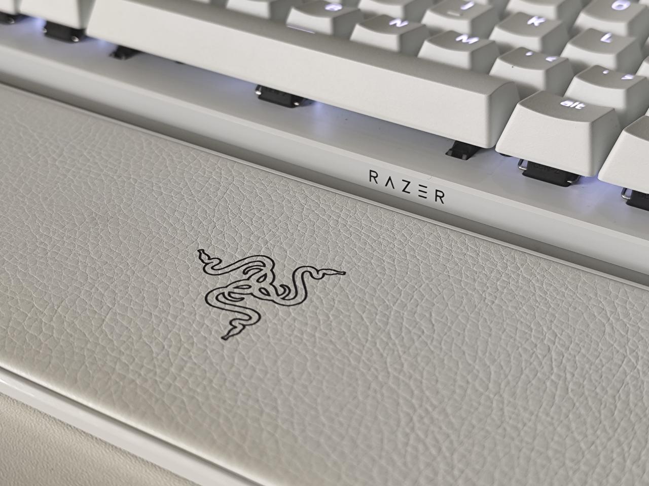雷蛇猎魂光蛛V3采用了分离式有线连接方式+USB-C编织线材,不易缠绕更耐用。附赠的腕托是人造皮革而非柔软材质,质感偏硬+高度适中,对手腕有着支撑效果。腕托和键盘之间有磁吸连接,中间雷蛇logo。