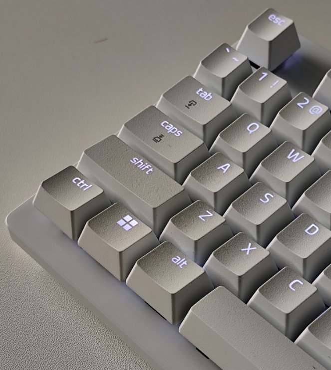 键帽为双色注塑的PBT,透光性更好。防沾油设计防褪色印刷,更加耐用。字符纹理有细致的磨砂处理,手感更好。键盘按压下去有段落感,声音清脆(温馨提示:游戏键盘请勿在图书馆等公共场合使用)