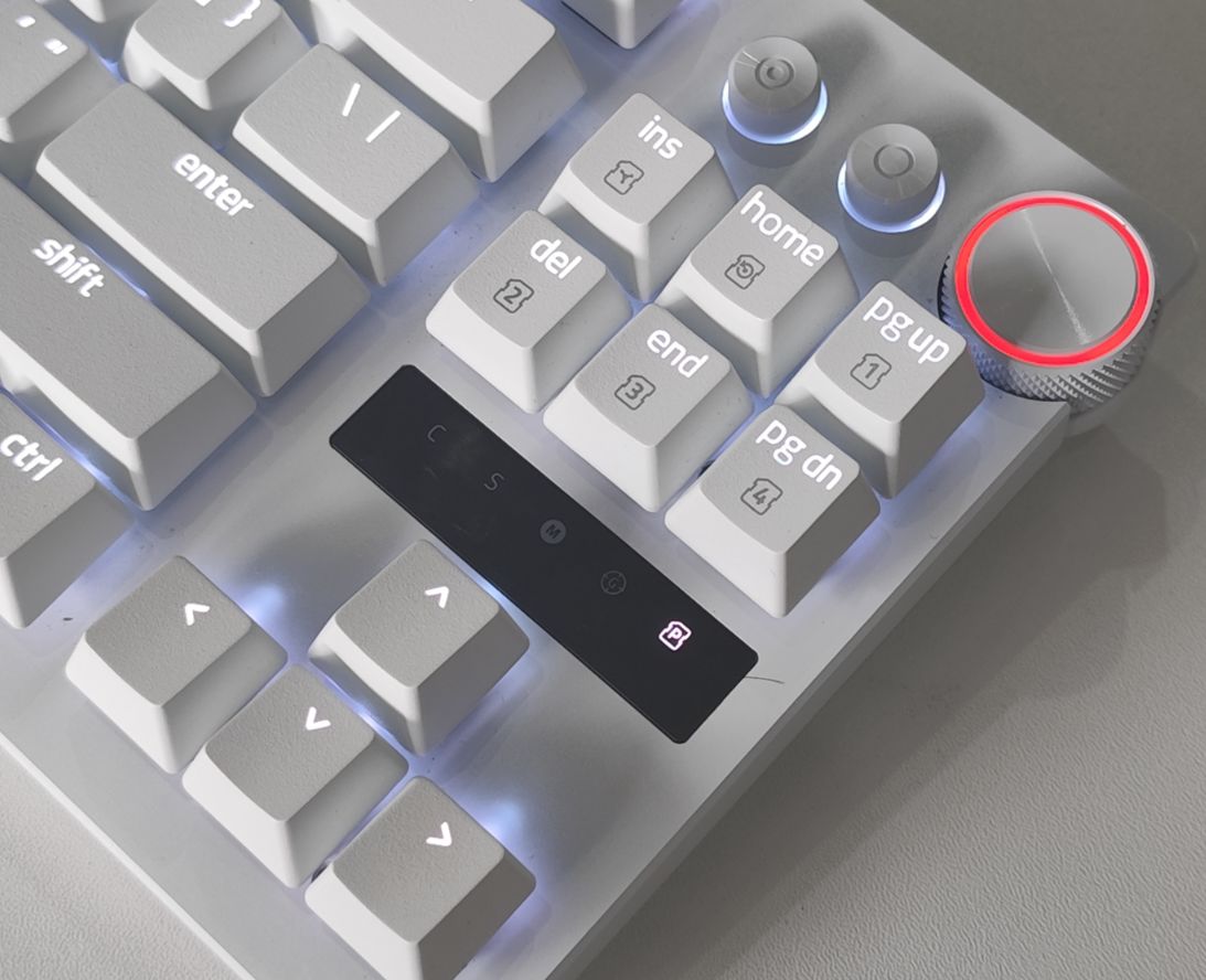 右上角分布着音量控制旋钮,旋转起来有段落感。当音量为0/静音时,按钮灯光会变为红色,另有多媒体控制按钮和自定义按钮(可以设置为一键启动某款游戏),按压手感清脆。三个按钮式下陷式布局,不突兀。