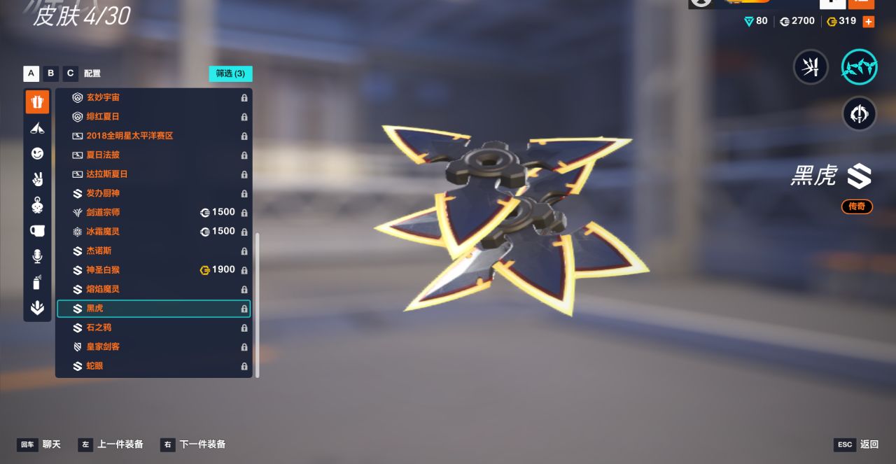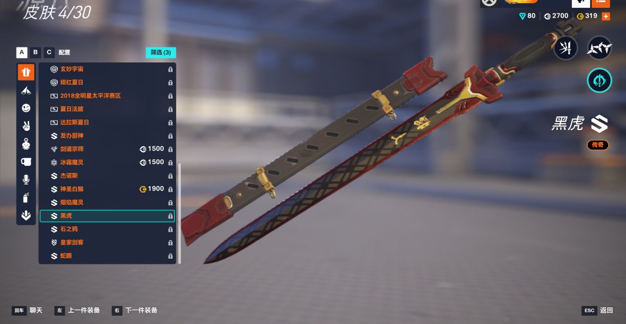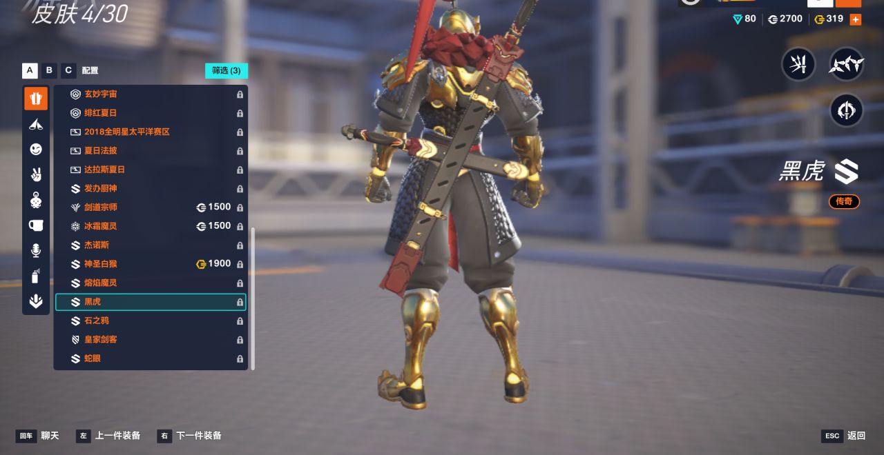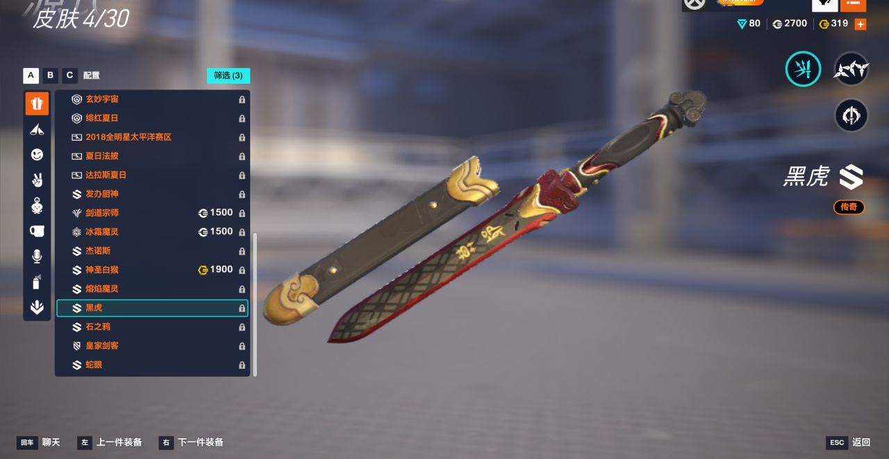 黑虎,暗黑和金色盔甲風,武器都被拉直了。飛鏢是平面尖角狀,劍爲長短直劍,有青銅劍樣的花紋,整體比較威嚴。對應同系列換色皮——白虎,亮銀色盔甲,藍色內飾,黑虎的紅色替換爲白色,直購1500白幣。