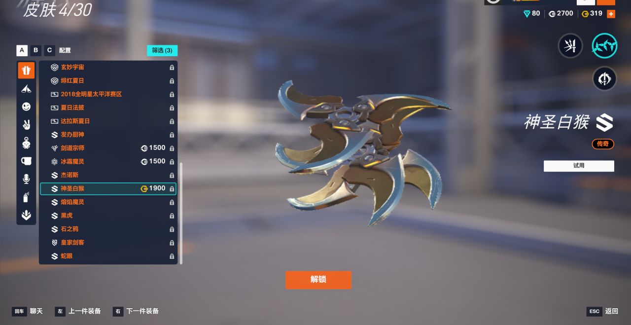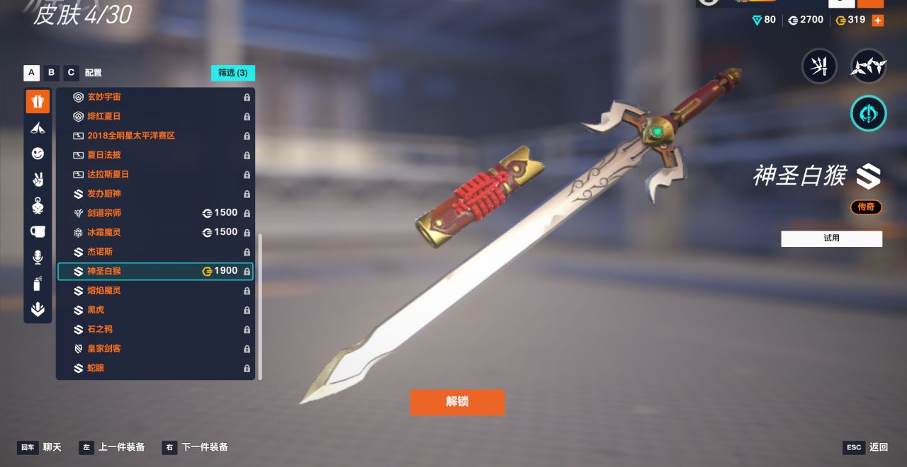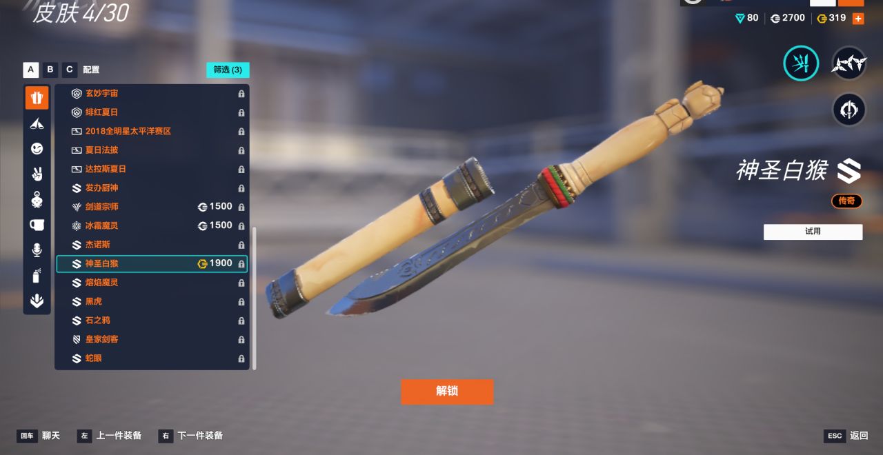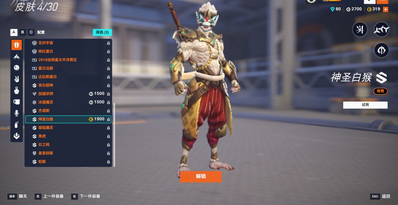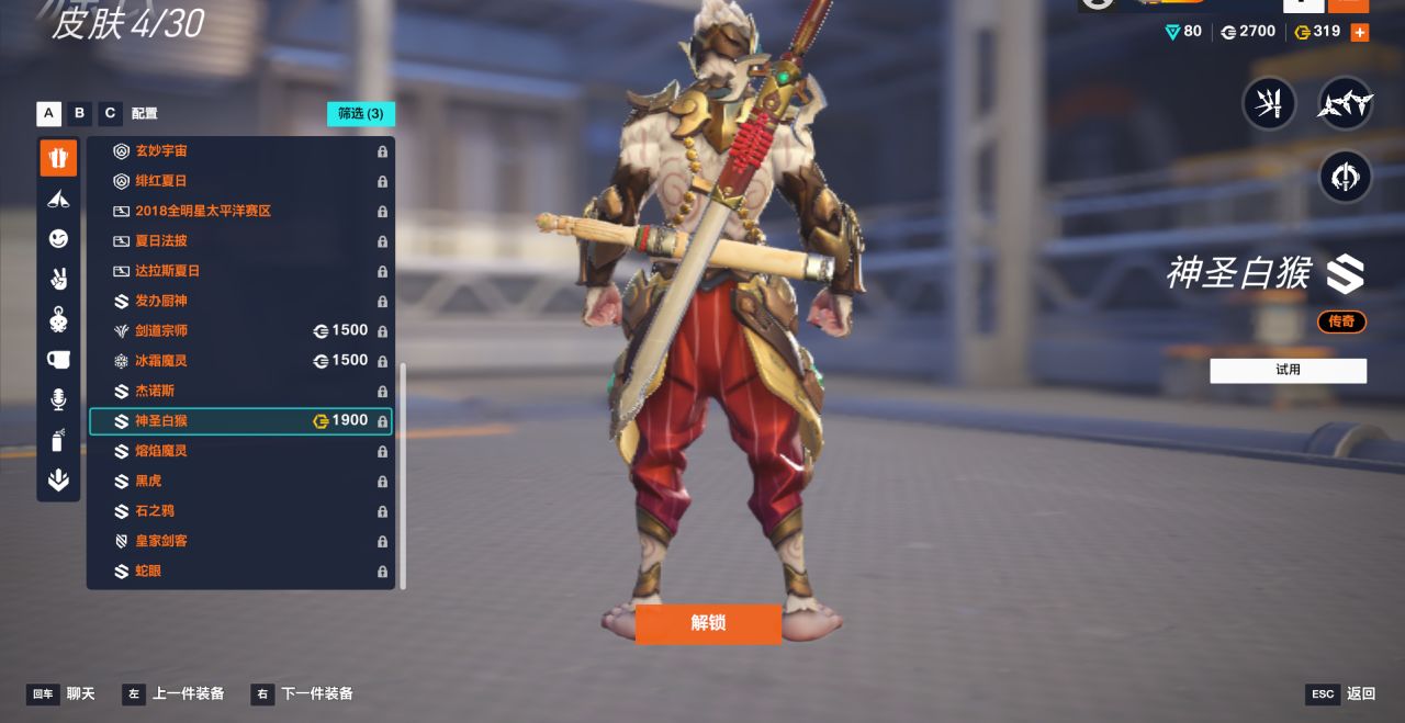 神聖白猴,直購1500金幣,沒什麼理由,就是覺得很好看,有一種修行的猴哥既視感。整體非常可以,造型武器均有變化,長劍沒有全包劍鞘,很有特色。