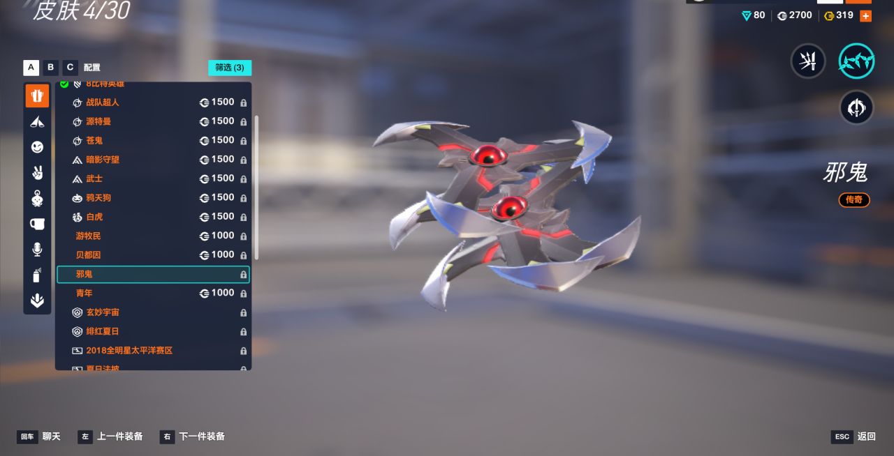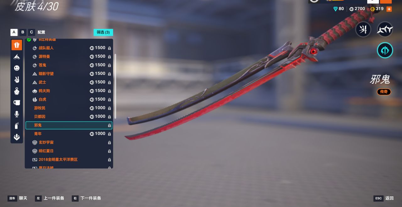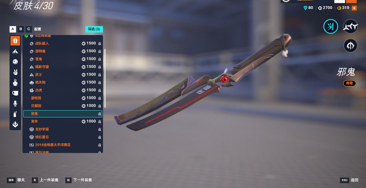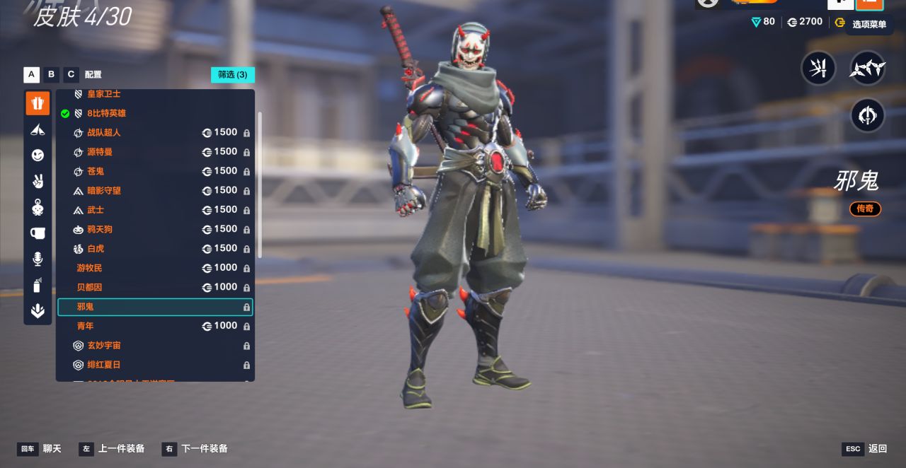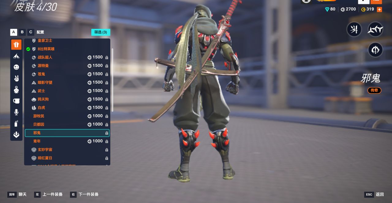邪鬼,忍者風黑色調,武器上都有紅色眼球裝飾,戴鬼面具。整體不錯,標準的忍者風格。對應的同系列換色皮——蒼鬼,白色調,邪鬼的黑色替換爲白色,白色替換爲紅色,紅色替換爲黑色,直購1500白幣。