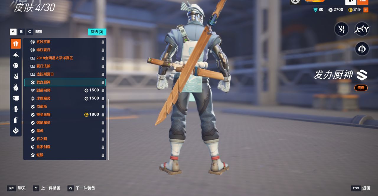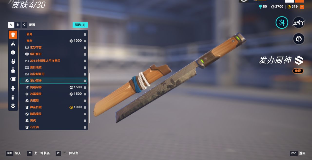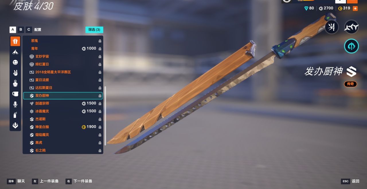 發辦廚神,創意皮,整體風格切換爲廚師風。武器爲木製加鐵質的廚具風格,短刀像水果刀,是真沒想象過長的廚刀,很有特色,喜歡的不容錯過。