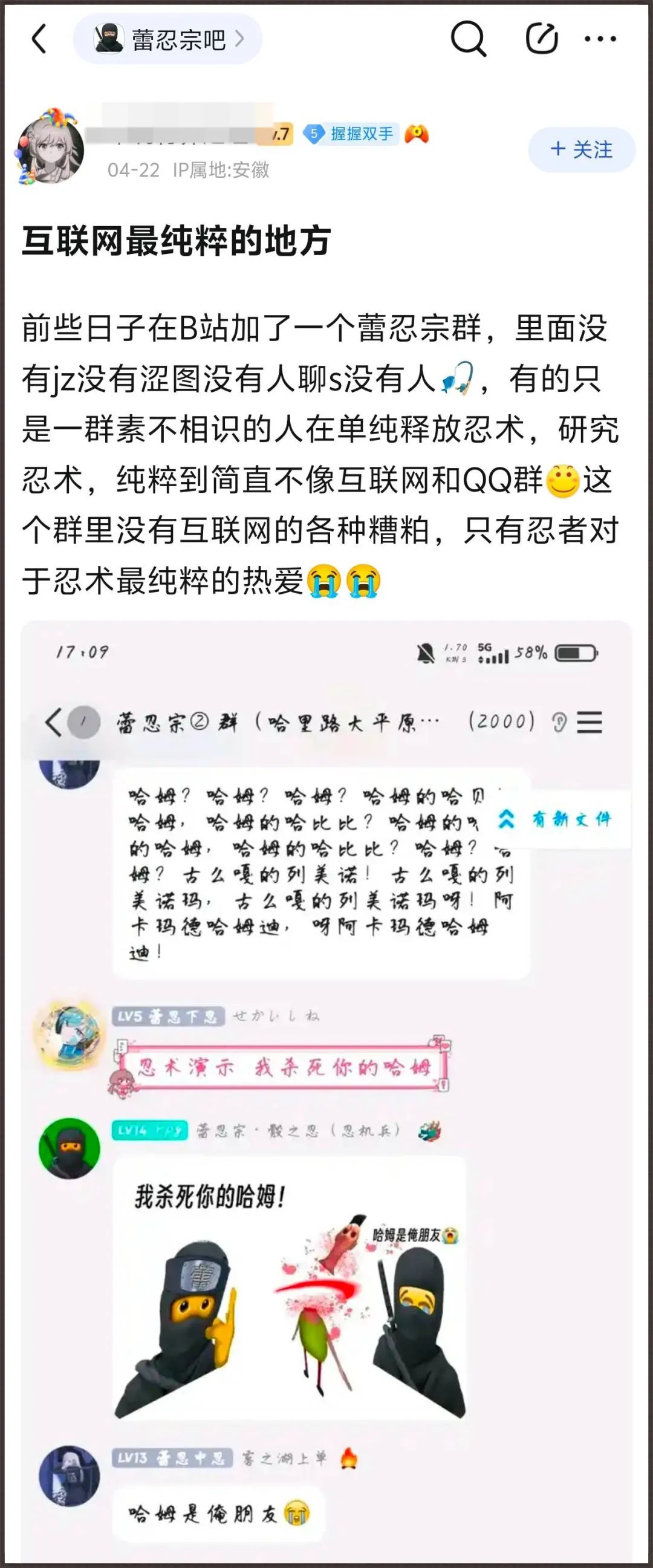 有人在百度“蕾忍宗”吧發帖,說前些日子他在B站加了一個蕾忍宗羣,裏面老哥沒有鑑證沒有瑟圖,有的只是一羣素不相識的人在單純釋放忍術、研究忍術,簡直純粹的不像現在的互聯網。