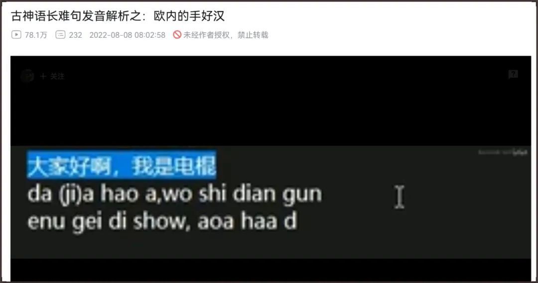 那時候網上比較火的還有LOL主播電棍的倒放聖經,經典【歐內的手 好漢】,倒放自【大家好啊,我是電棍】,常被活用於動物園(電棍、山泥若、炫狗,對應猴豬狗)的鬼畜二創。