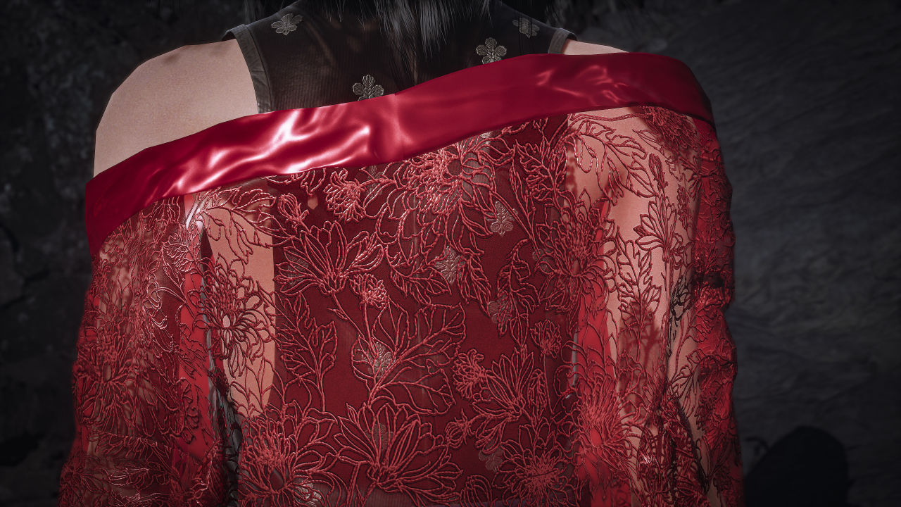 仔细看一下身上披的红纱,蛮细的