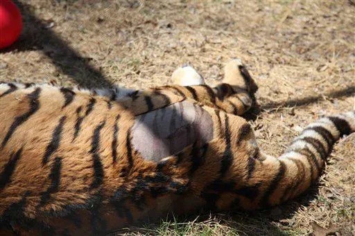 最后的最后,即使把毛剃了,也能看到……老虎皮肤上也有黑色条纹哟。