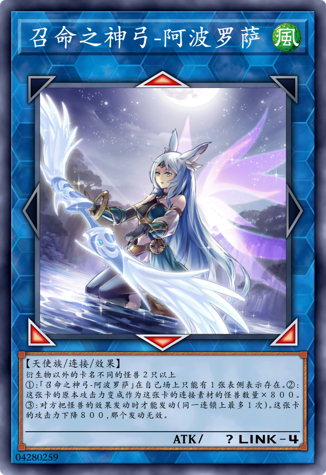 召命之神弓-阿波羅薩:誕生於數字盒1009「Rising Rampage」,發售時間爲2019年4月13日。於2024年9月2日被指定收錄於TCG禁限制卡表中,限制等級爲禁止。隨後在2025年7月又被收錄進OCG禁限制卡表中,限制等級爲禁止。