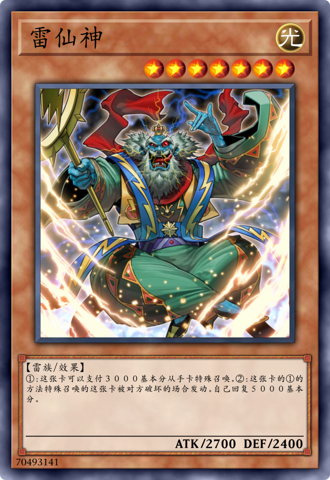 【雷仙神】介紹了那麼多的老卡,最後介紹1張新卡。這張卡的效果老實說是有點抽象,支付3000血量,就只是將這張卡特招上場而已。雖然說血量確實是遊戲王裏面最不值錢的單位,但是也至於像這樣子用來揮霍吧。