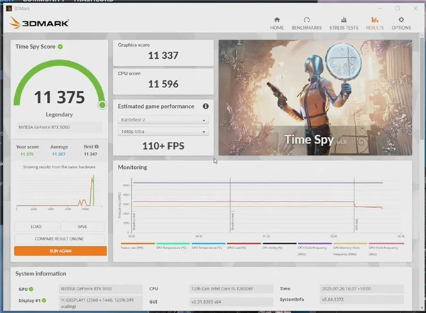 最终RTX 5050不仅在性能上超越了1080 Ti,还在3DMark Time Spy的基准测试中取得了11377,这也是该型号显卡的前六名成绩。