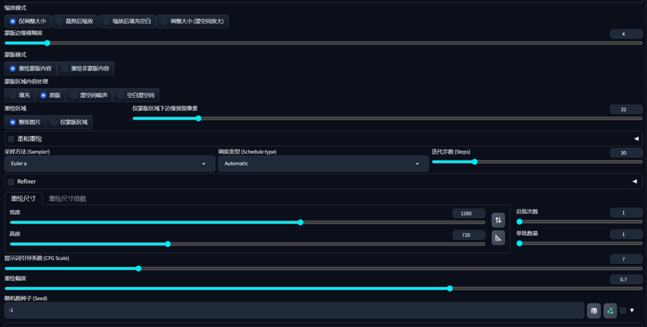 原來圖片的尺寸爲1280*720,重繪尺寸爲寬度=1280+64*2=1408,高度=720+64*2=848,按我說的這樣設置,一會你就明白了。