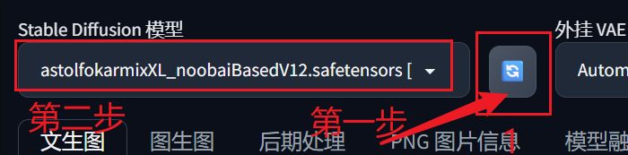 先切換成我們剛下載的checkpoint大模型。先點下圖中右邊那個刷新鍵,再在左邊的下拉中找到你下載的那個模型。