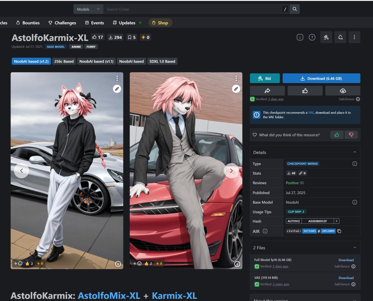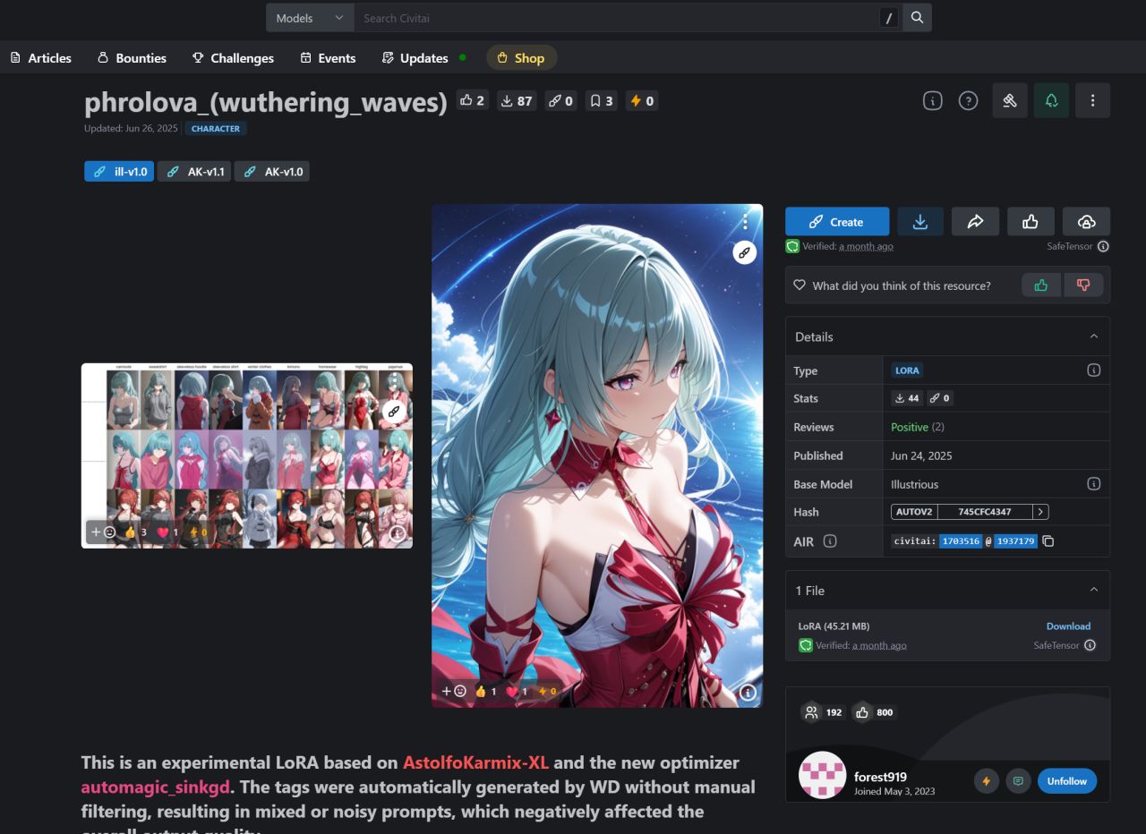 我使用的模型:Checkpoint: astolfokarmixXL,Lora: phrolova_(wuthering_waves)。那就在Civitai上分別搜索這兩個模組就行。分別是下面這兩個: