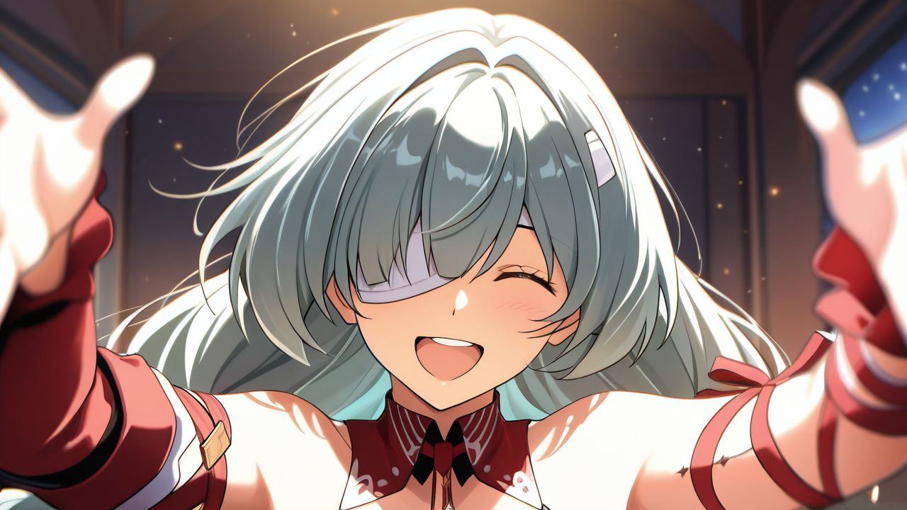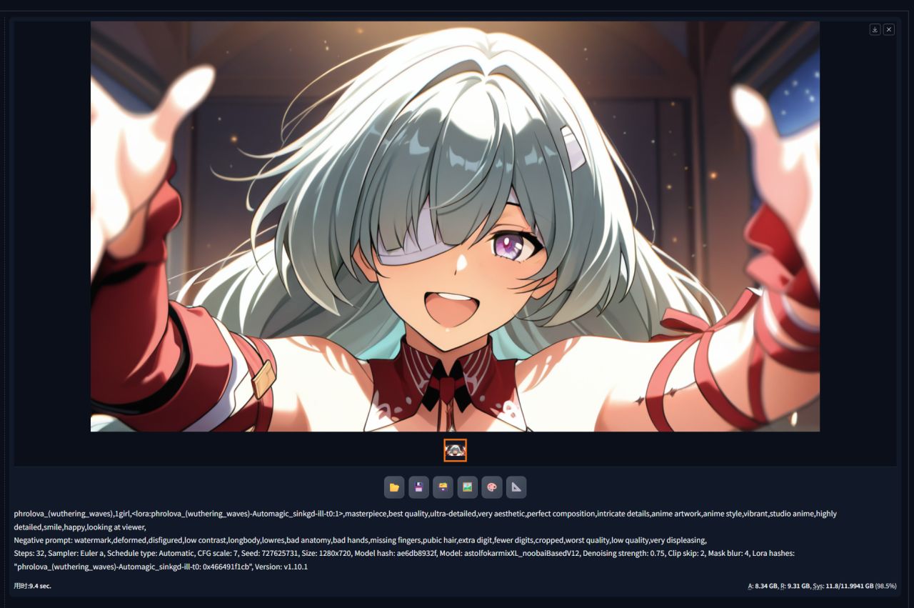 填入正向提示詞:phrolova_(wuthering_waves),1girl,<lora:phrolova_(wuthering_waves)-Automagic_sinkgd-ill-t0:1> ,masterpiece,best quality,ultra-detailed,very aesthetic,perfect composition,intricate details,anime artwork,anime style,vibrant,studio anime,highly detailed,smile,happy,