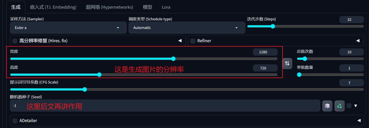 所以一般用小分辨率生成,然後再放大。我目標是生成一張電腦壁紙,那先用720P分辨率這麼設置!