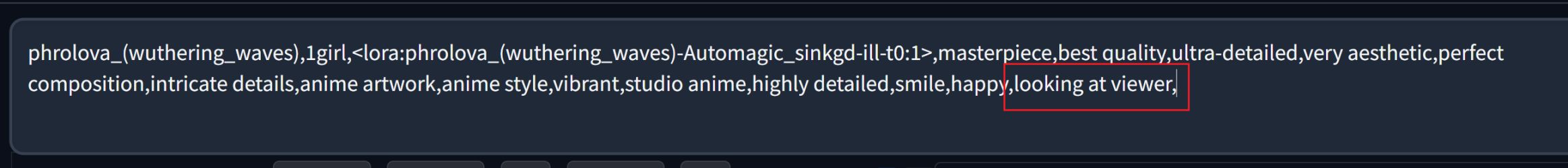 現在我想要睜眼的效果,那我就在正向提示詞區域中增加looking at viewer這個關鍵詞: