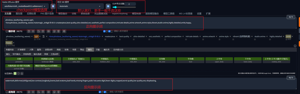 CheckPoint:就是底層算法。是必須要有的模型。你可以理解成一本字典。你讓他畫啥他就在字典裏面找,然後根據字典裏的解釋幫你繪製出來。但是難免出現字典裏沒有,或者存在他不理解字典的情況。比如說我想讓它畫弗洛洛,它可能字典裏沒有弗洛洛,或者它只知道弗洛洛是鳴潮的人物,那麼它畫出來的可能就根本不像弗洛洛。這就需要用到下面的LoRA模型來告訴他弗洛洛長什麼樣,要按照什麼方式繪製!這本字典裏面包含了大量的信息,包括人物動作、畫風等等,因此這種模組往往在6G以上。