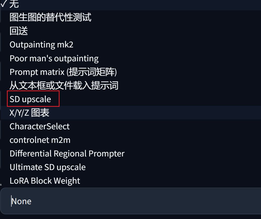 這次我們點擊這個按鈕,讓這張圖進入圖生圖界面。老樣子,提示詞什麼的都已經繼承過來了。此時我們把頁面拉到最底端,找到腳本這個區域。默認是“無”的狀態: