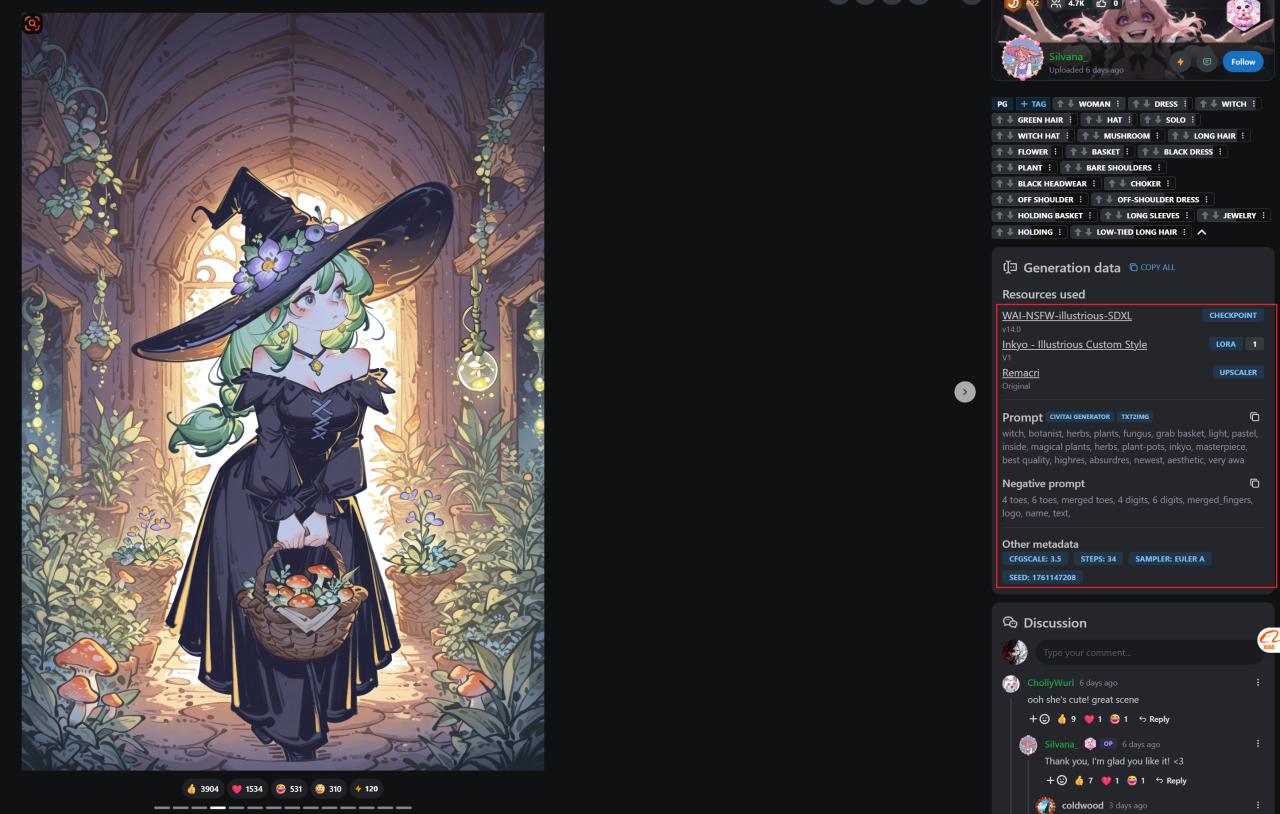 如果你不知道要什麼樣的模型,沒關係,你點擊任何一張圖片,裏面基本上就會有作者提供的AI生成的各種信息: