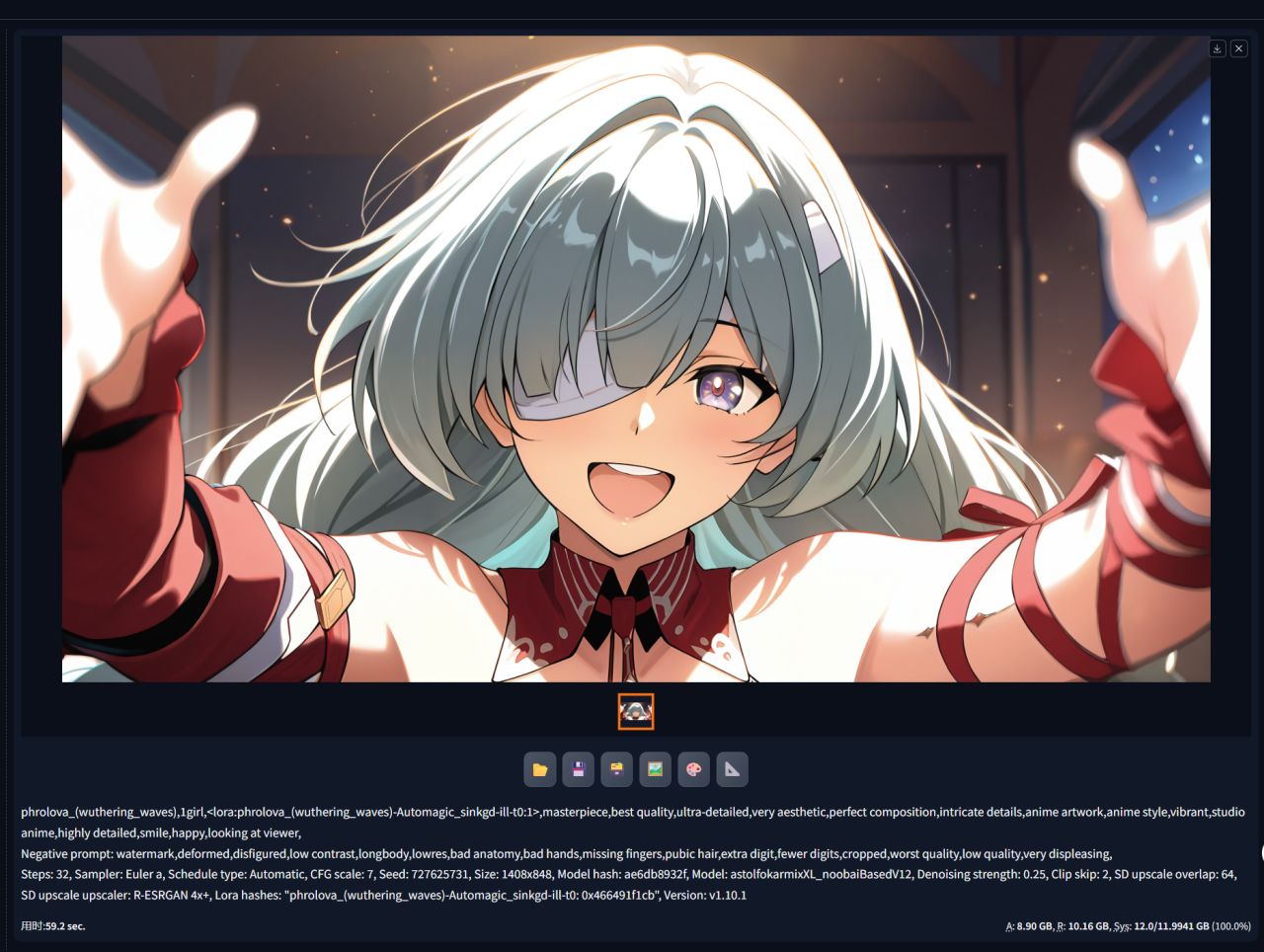 這個方法簡單快速,就是在剛一開始就把你想要的圖放大到了你要的尺寸。直接完事!但是!這個方法有個缺點,就是它仍然是通過把整個圖像重繪生成的,所以你的顯卡不夠的話,想放大更大仍然無法實現。我4070顯卡生成到這個尺寸基本已經極限了!