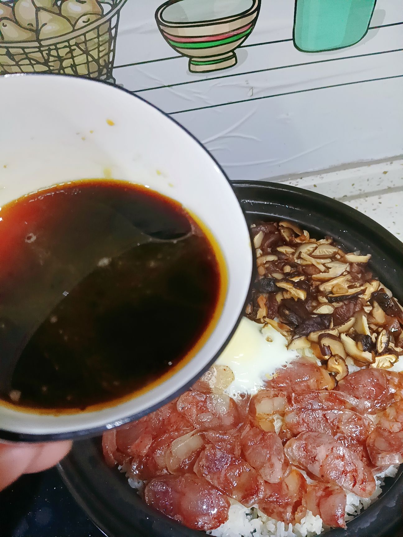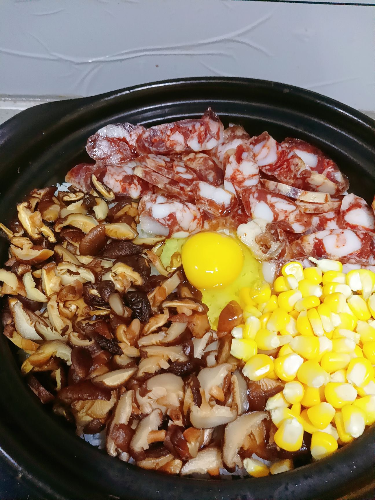 放玉米粒,香菇,香肠,放一个蛋。盖上盖子,锅盖中边淋上油,全程小火,要不定时转动锅子,我就是中间急了,开个中火,焖了几分钟,马上闻到有一股糊味,幸亏糊的不多。蛋凝固就差不多了,香菇比较容易熟。我忘记焖了多久时间