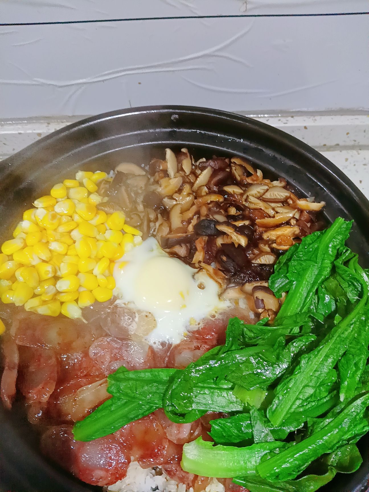 食材:米,半个玉米,干香菇,油麦菜(配自己爱吃的蔬菜。)香肠(我用的是自己做的四川口味香肠)一个鸡蛋