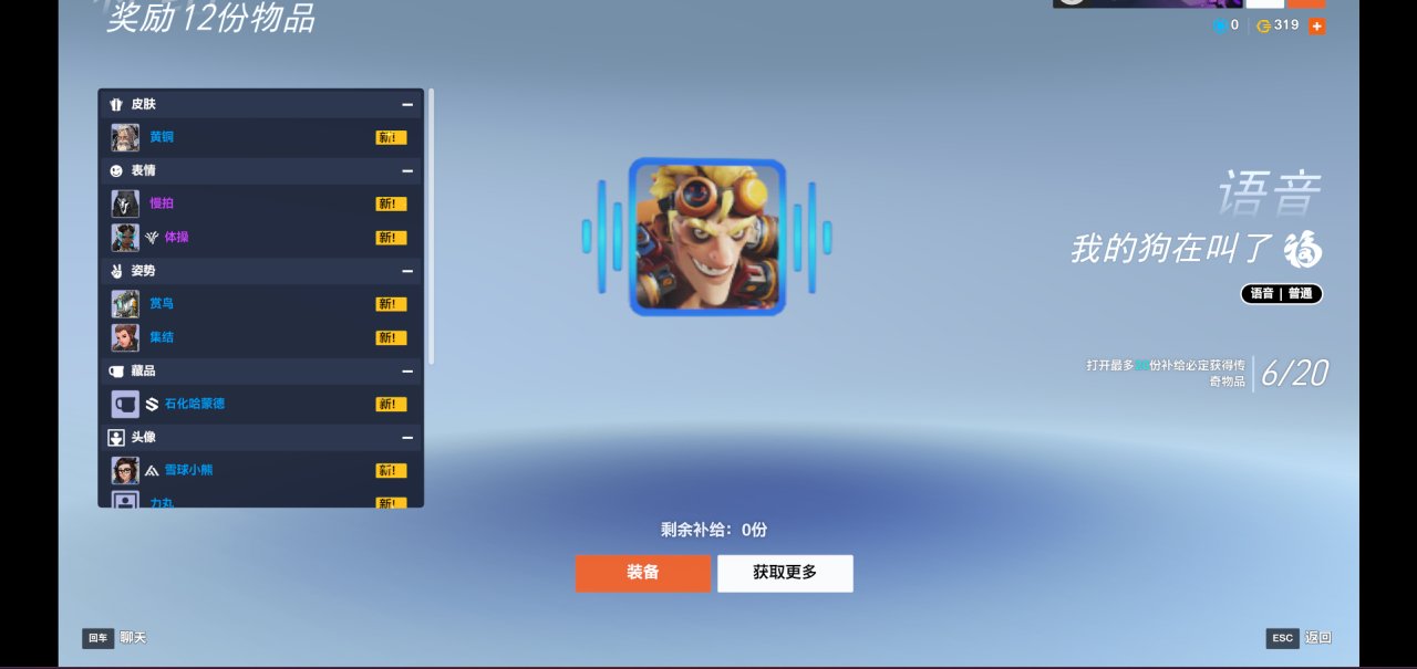 朱諾唯一可選的金皮異界使者活動第一天就看出來28箱3金開出來了,附帶朱諾的兩個藍皮和特寫。選了3個箱子,藍天白雲,唯一好玩一點的是狂鼠的語言,有人在對局裏狂發語音或者在頻道狗叫時可以發這個。